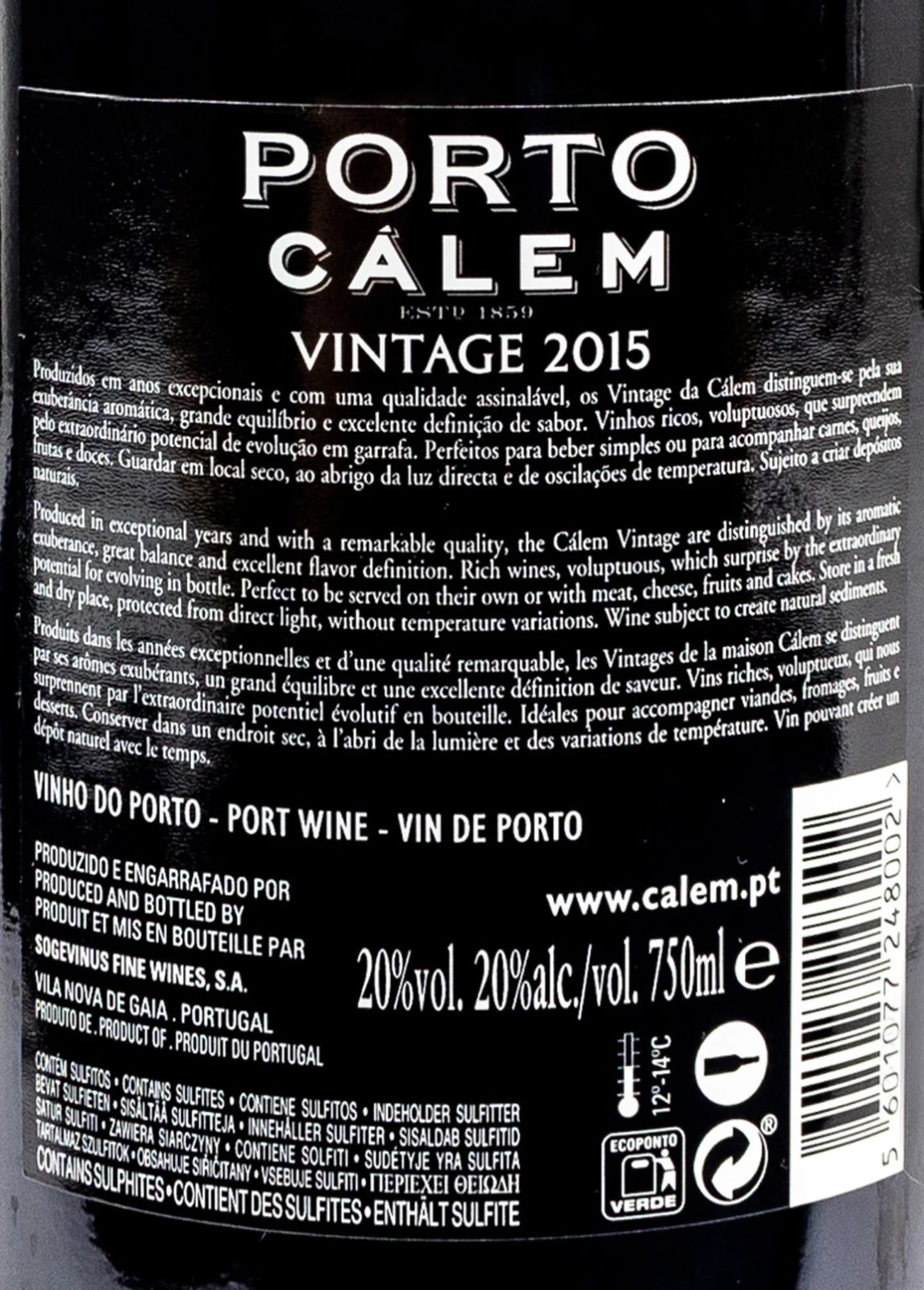 The Cálem 2015 Vintage Port Wine is noted as having aromas of “black fruit and hints of spice and cocoa” with a “robust and sweet” palate. It is a blend of 30% Touriga Naçional, 30% Touriga Franca, 30% Tinta Roriz and 10% Sousão.