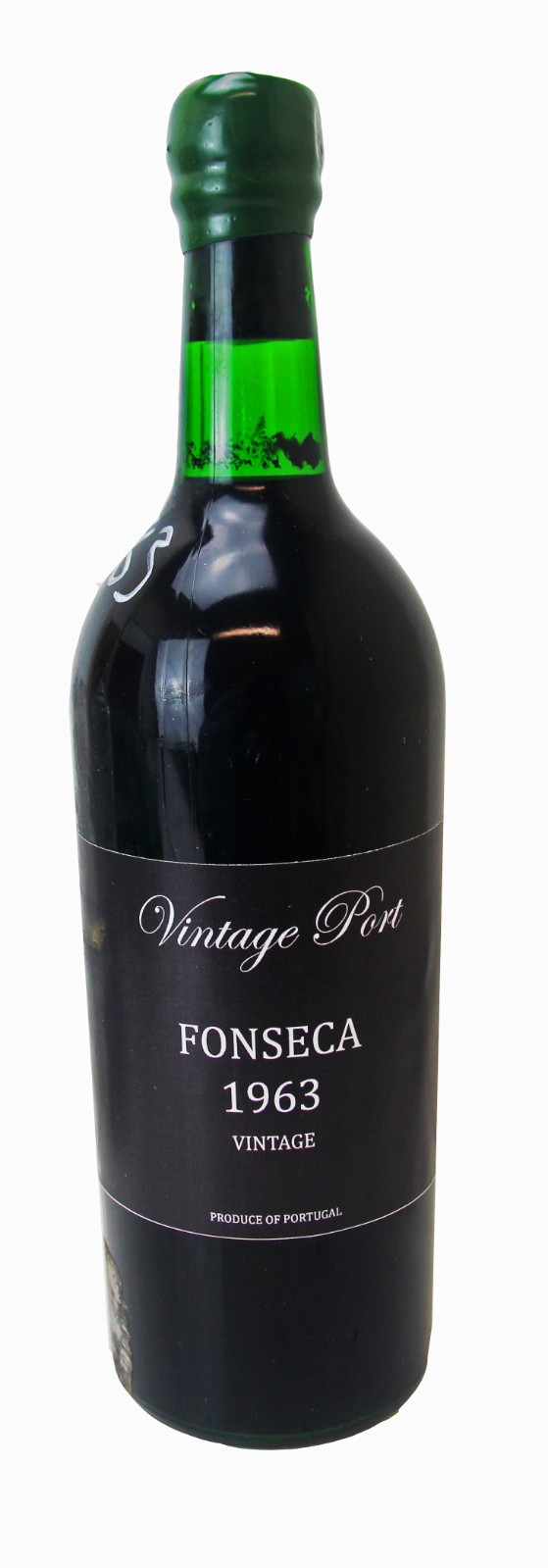 Mid-shoulder level, missing capsule, plain label. Cork shows Fonseca 1963 through glass.