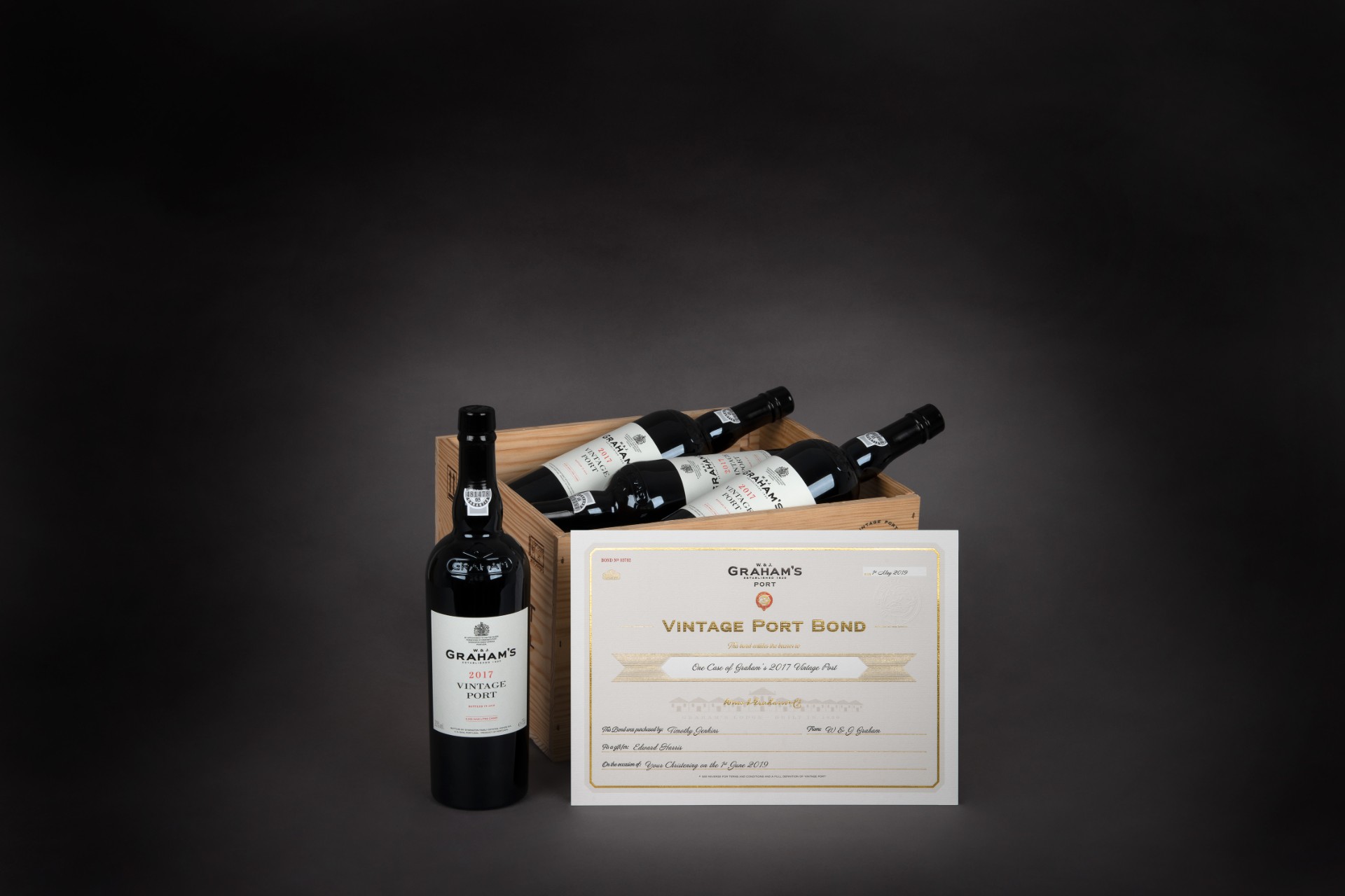 Given that Port is usually not released until the second spring after a particular vintage is harvested, it was previously difficult to buy a case of Port as a commemorative gift as it would have to be done retrospectively. Graham's have overcome this problem, through the Vintage Port Bond. Graham’s can guarantee one case of vintage Port in the year of the harvest, to be redeemed once the wine is bottled and shipped around 18 months later.