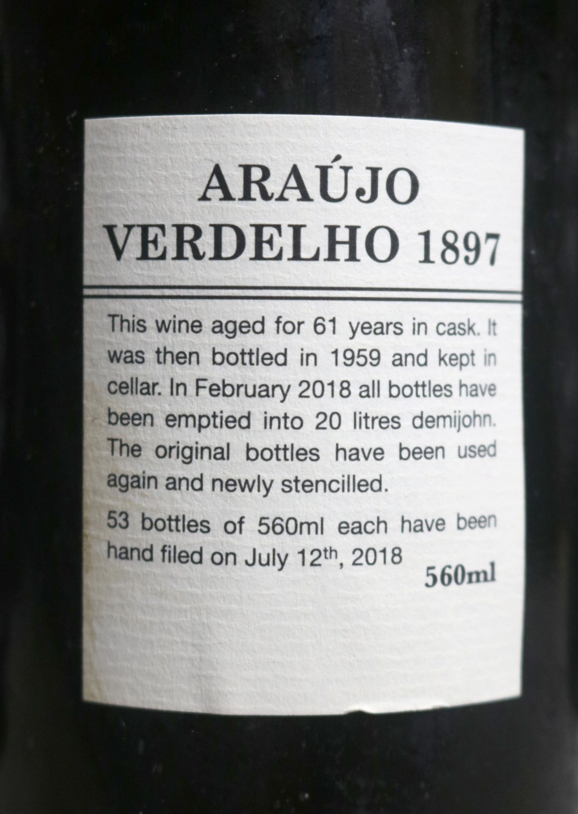 This is a rare and limited release of the 1897 Madeira from the Araujo family cellars. The bottles are in perfect condition. There is something ethereal about tasting such a rare vintage. The 1897 Verdelho is very dry as one would expect from this style of Madeira. There is a huge amount happening on the complexity front with some bitter nut skin notes with dried flowers and citrus pith. Although quite dry, this does not come across as too severe. An electric wine that is astonishingly refreshing. Massive finish that goes on and on.