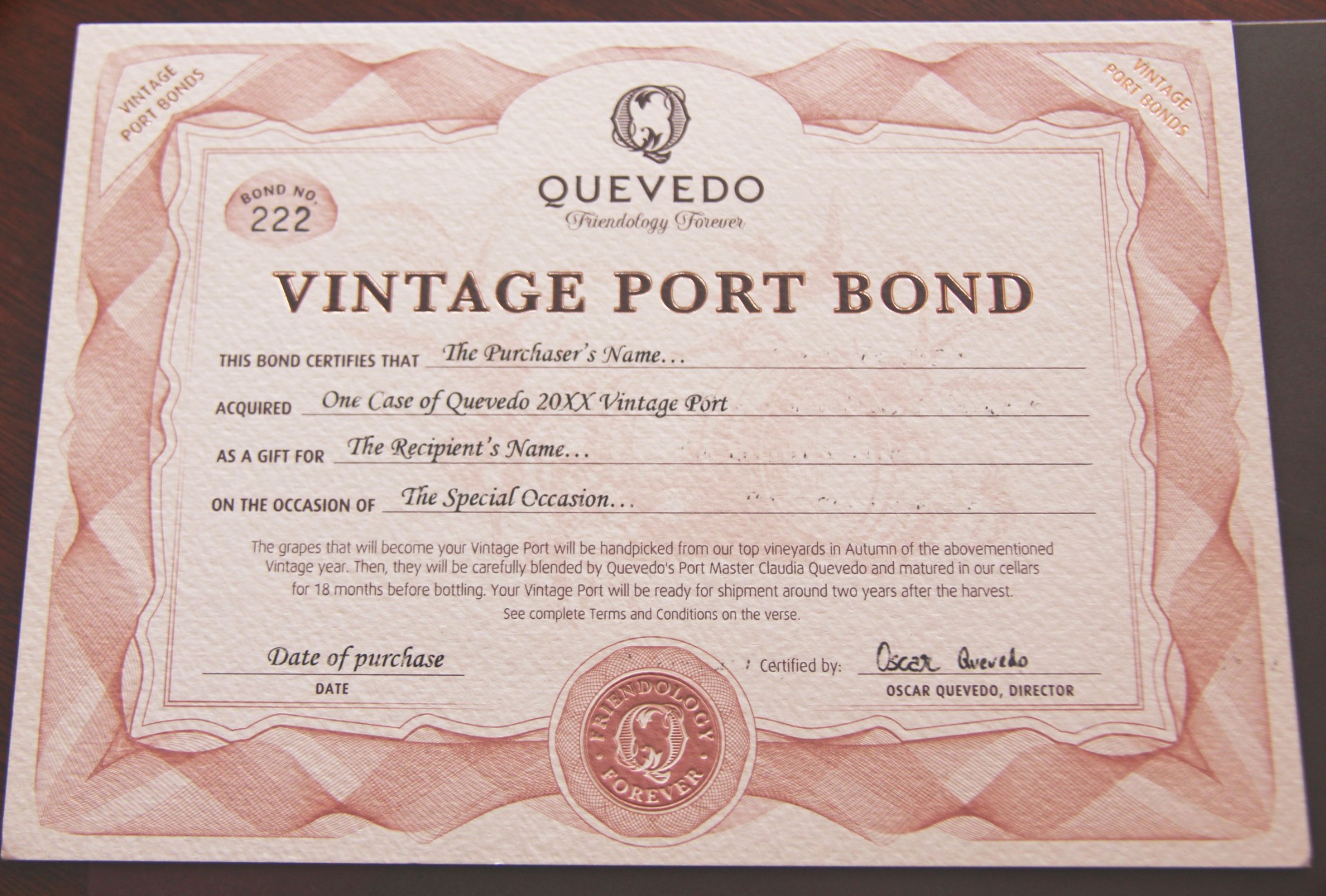 The buyer will receive a “Vintage Port Bond Certificate” on purchase, with personalised certificate that can be gifted to the child in their year of birth, or given to a married couple at their wedding, despite the wine still being on the vine.